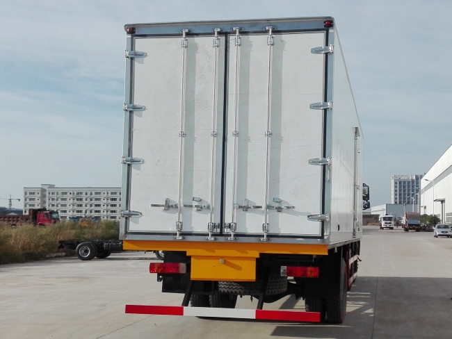 我公司《晶龍工藝》技術,采用1200噸液壓加熱固化設備一體成型生產線制造,廂體保溫技術達到國家A級標準。1、全密封樹脂膠粘連聚氨酯發泡板高壓加熱固化而成,廂板厚度為8cm;2、廂板內外面料為2.5mm厚新款玻璃鋼;3、粘連輔料為玻璃纖維絲布;4、板塊結構聚氨酯發泡保溫材料;5、全密封樹脂膠粘連;6、預埋實木廂體加固;7、廂體框架為防銹處理槽鋼支撐;8、鋁合金包邊/不銹鋼包角;9、廂體內部加裝LED照明燈;10、廂體加裝LED示寬燈;11、3.5米廂體以上加裝LED邊燈;12、廂體后門框為不銹鋼制造及不銹鋼鉸鏈(俗稱:不銹鋼合頁);13、加厚不銹鋼鎖件;14、后門加裝防撞膠塊;15、采用三元乙丙橡膠密封條;16、3M反光膠板。