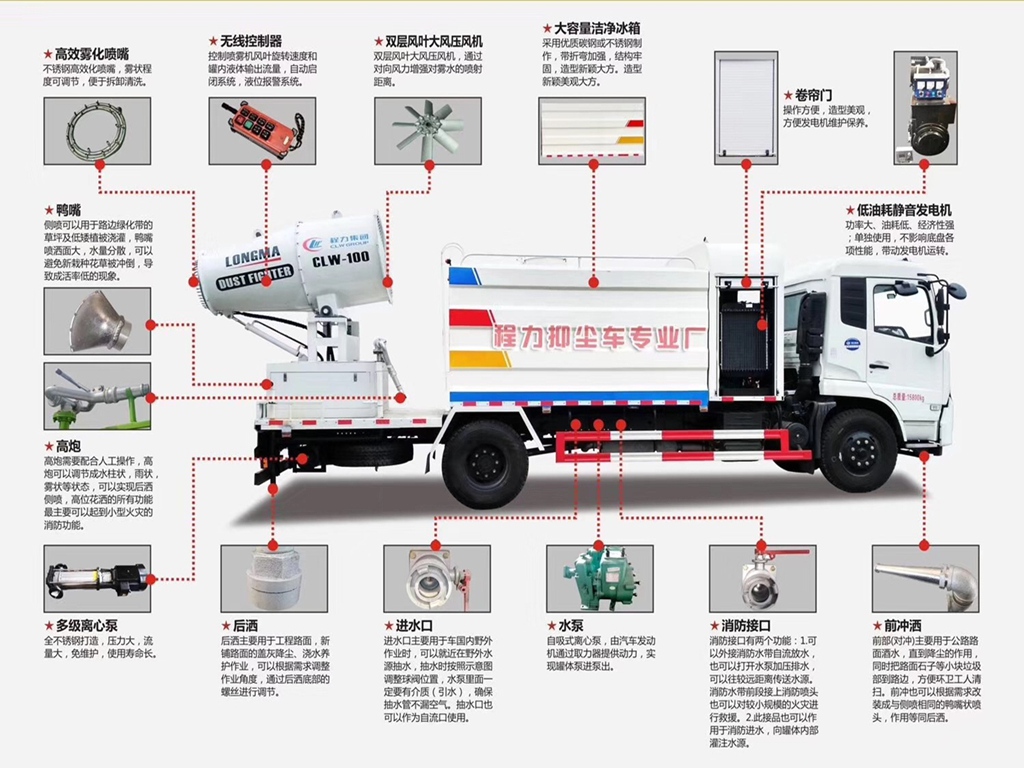 • 霧炮抑塵車:用于鐵路煤炭運輸煤揚塵污染防治,也廣泛用于其它散裝物料運輸過程防揚塵污染以及渣料場、儲煤場、建筑工地、汽車運煤揚塵、固沙、鋼鐵建材、水泥、企業各種露天料場生態護坡等方面。同時具備灑水車功能,在噴灑作業時可實現360度旋轉,后平臺高炮可同時進行旋轉,并可電子遙控操作,射程30-120米均有。